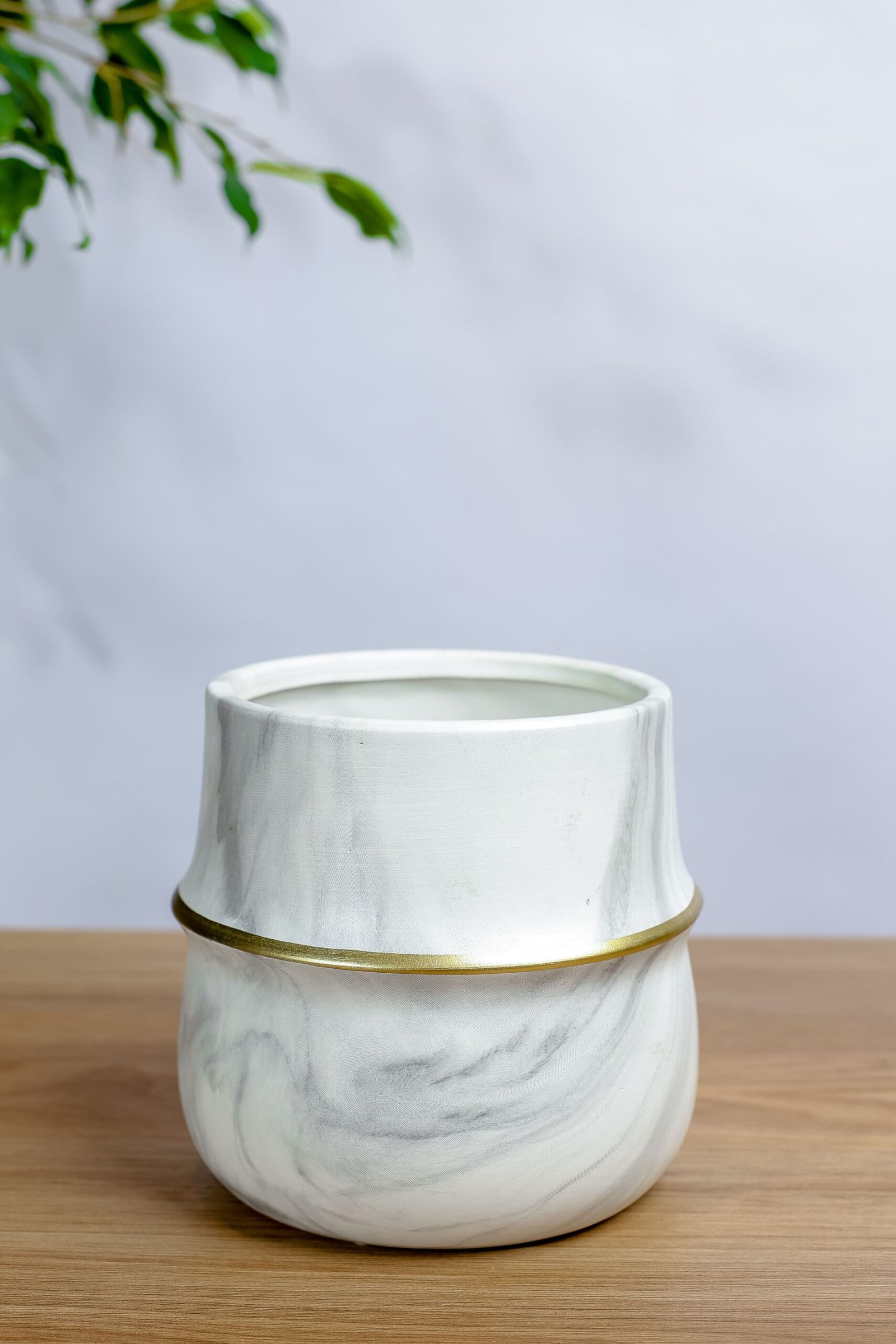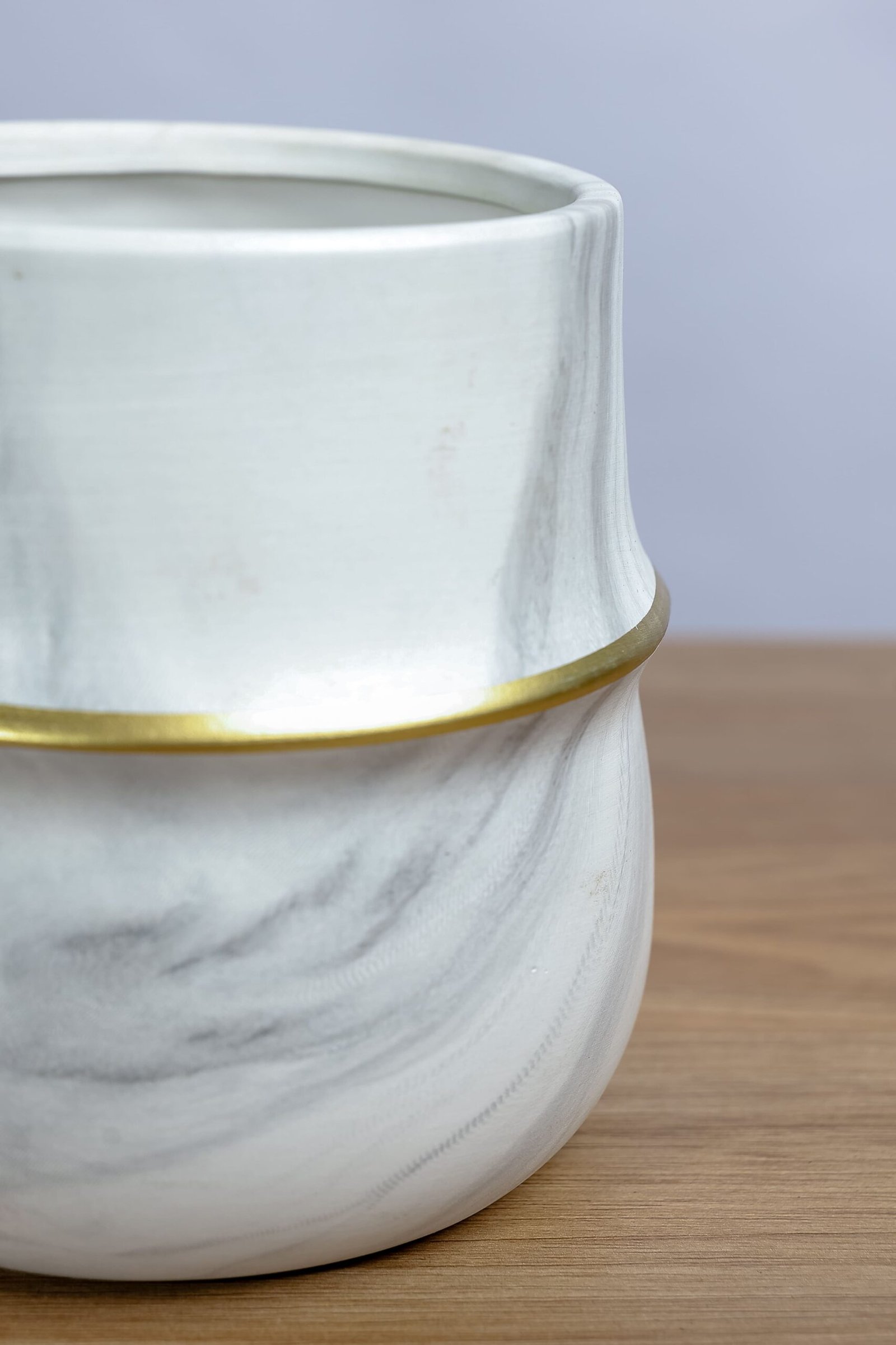 حوض نباتات رخامي بتصميم دائري أنيق، مزوّد بحزام ذهبي يضيف لمسة فاخرة وعصرية. مثالي للنباتات الداخلية، ويضفي جمالًا على أي زاوية في المنزل أو المكتب.