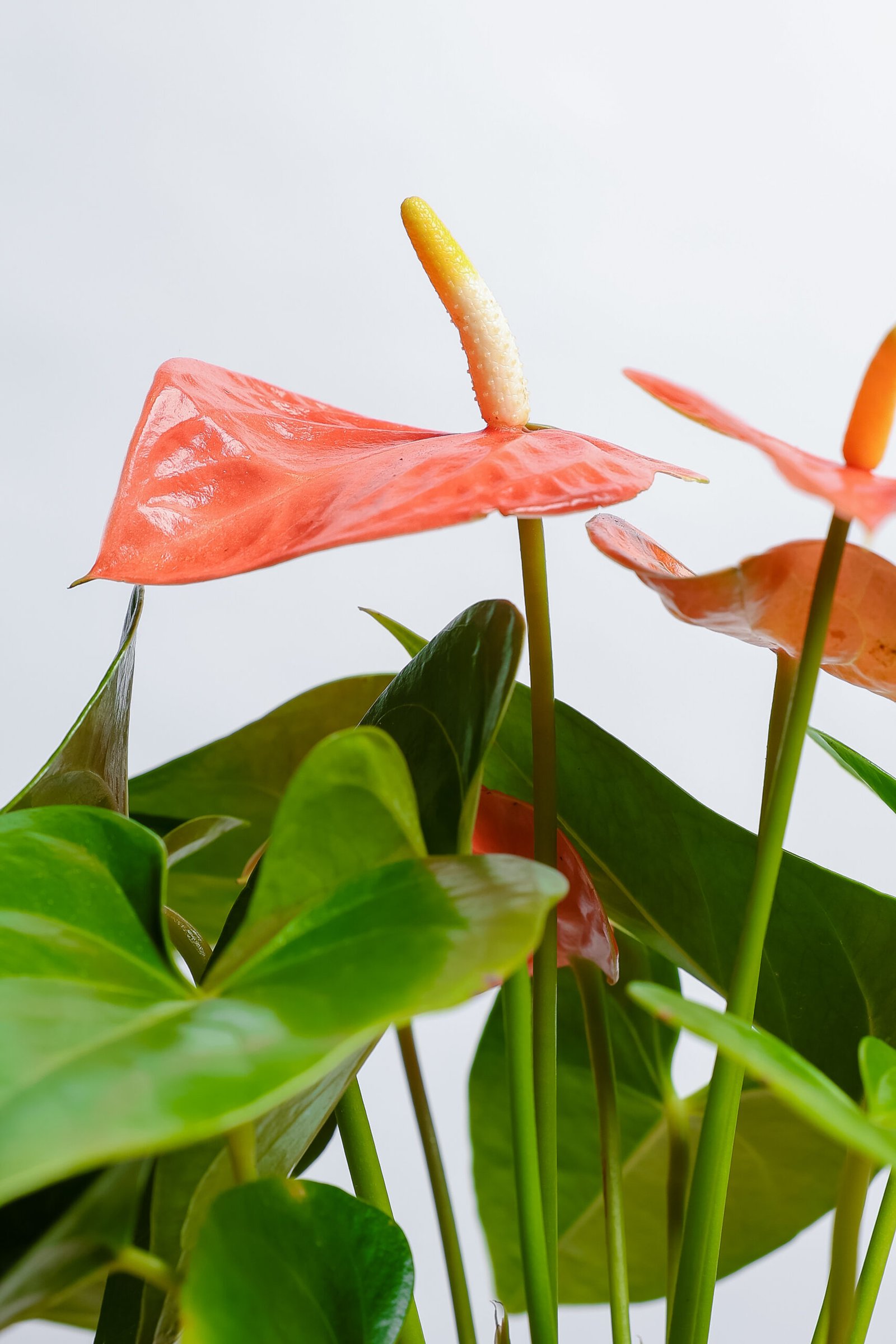 نبتة انتوريوم بأزهار وردية في اصيص أنيق من السيراميك باللون الزيتي ، تتميز بزهورها المشرقة وأوراقها الخضراء الزيتية الجميلة.