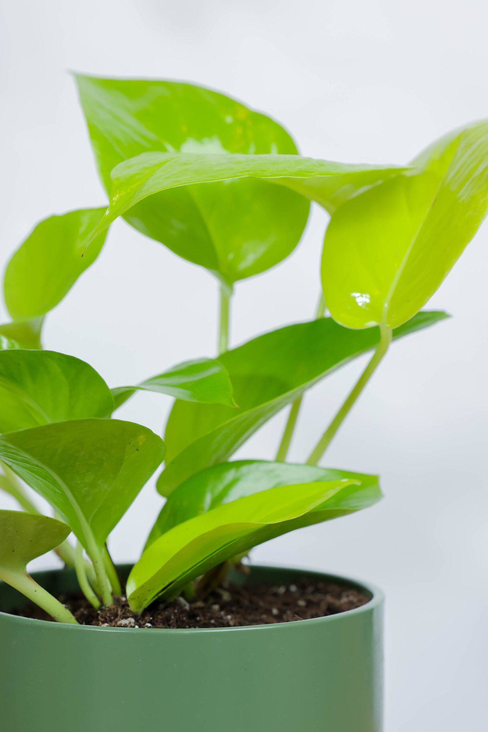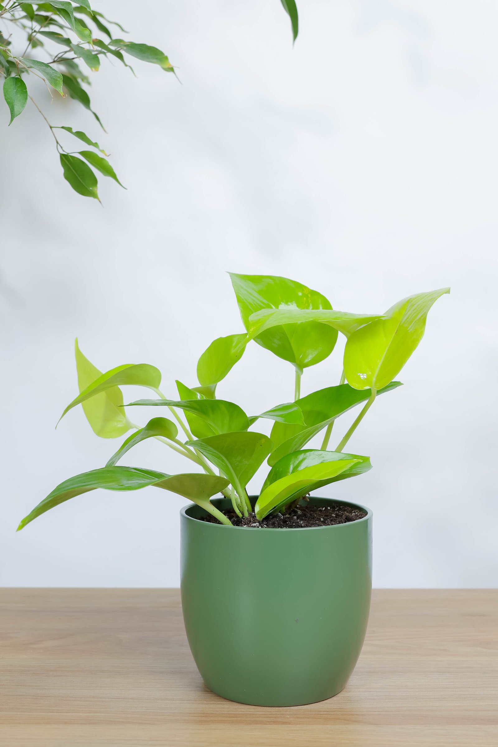 نبتة بوتس نيون في حوض اصيص سيراميك أخضر ،  تتميز بأوراقها الفسفورية الجميلة، تعتبر البوتس من النباتات الداخلية القوية والناجحة جداً، تتميز بلون جميل وتمتد بشكل سريع نسبياً ولاتحتاج للكثير من العناية.