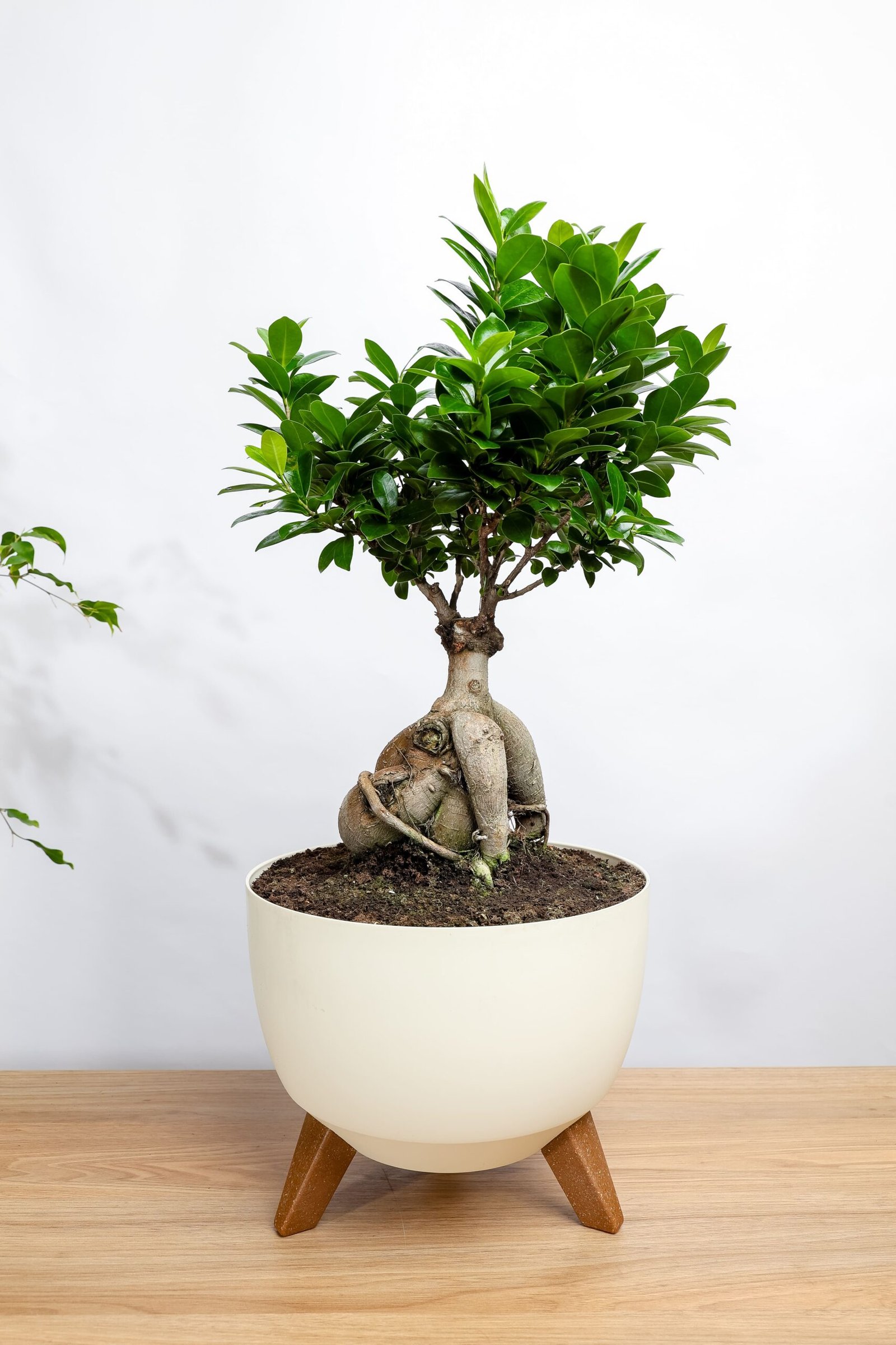 امنح مساحتك طابعًا مميزًا مع نبتة بونساي كبيرة، تجمع بين أوراقها الخضراء الداكنة وشكلها المقوس الطبيعي، لتضفي لمسة من الهدوء والتناغم البصري على أي ركن توضع فيه. تأتي في حوض دائري أبيض مصقول، يرتكز على قاعدة خشبية تضيف ثباتًا وجمالاً لإكتمال تناسق الألوان.