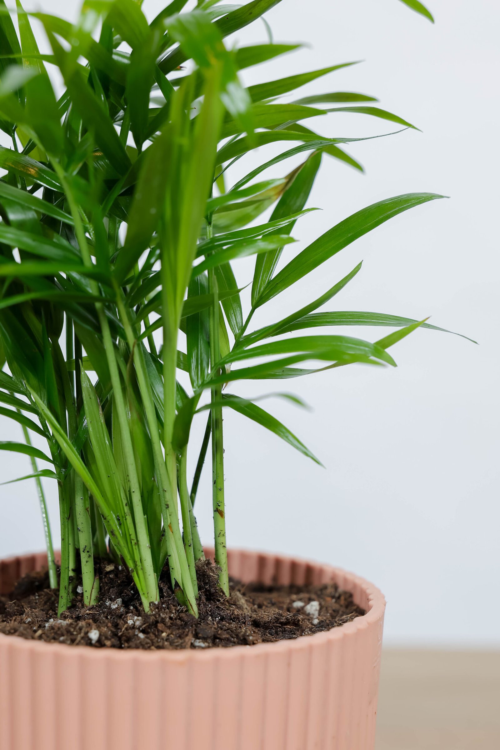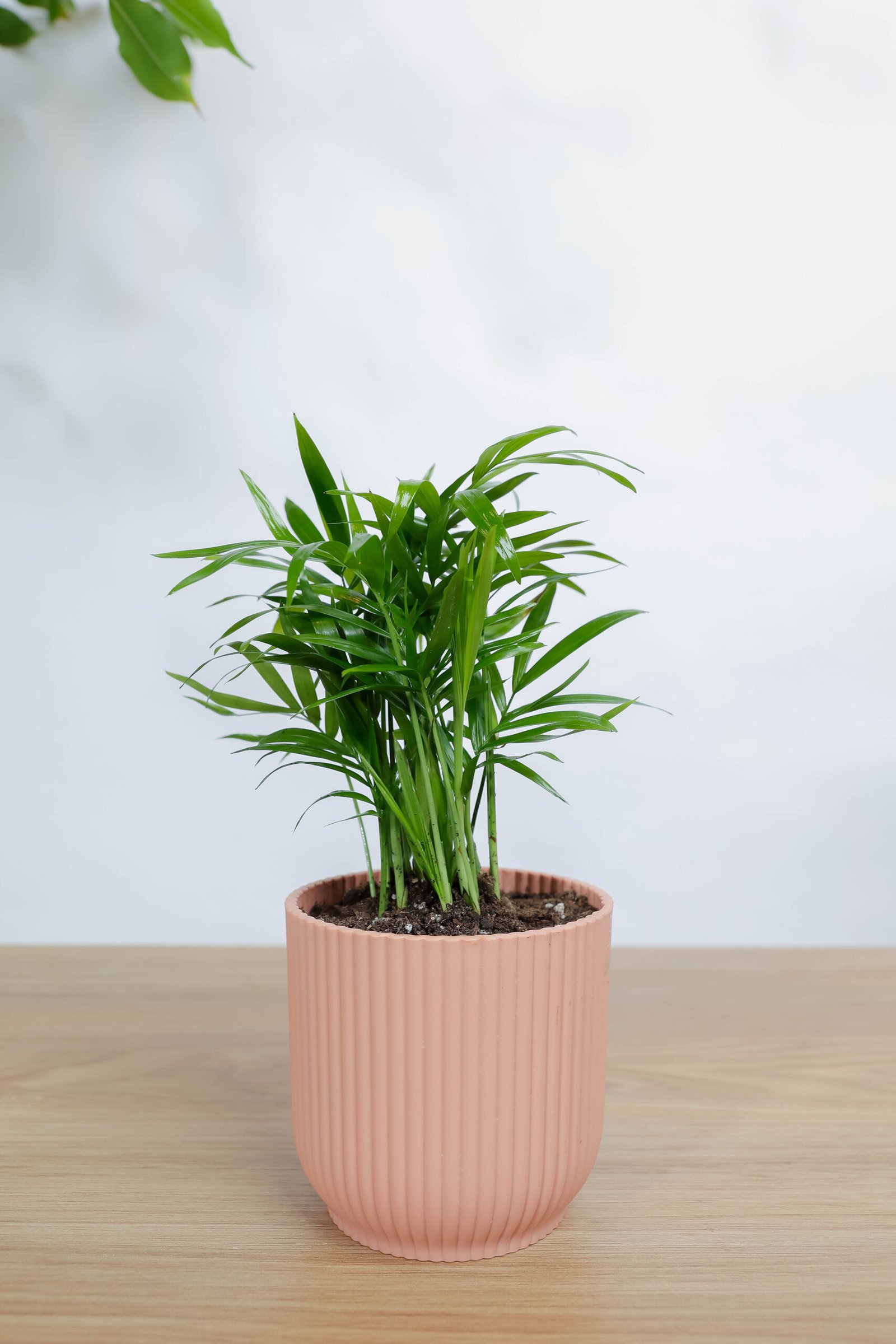 نبتة تشامادوريا في اصيص وردي مخطط
