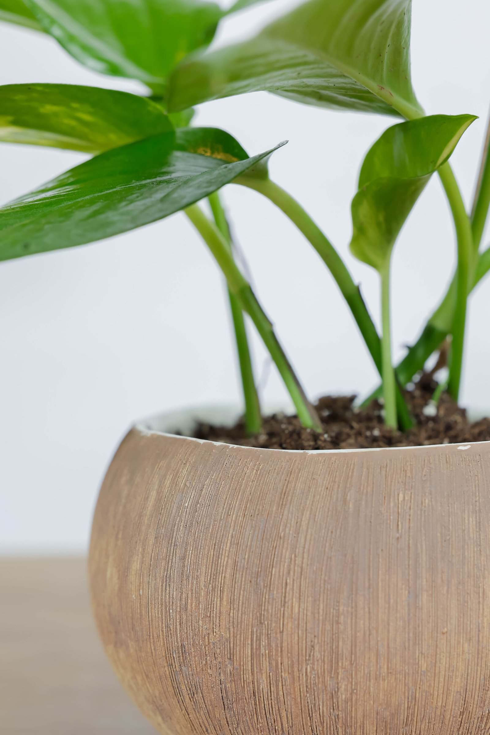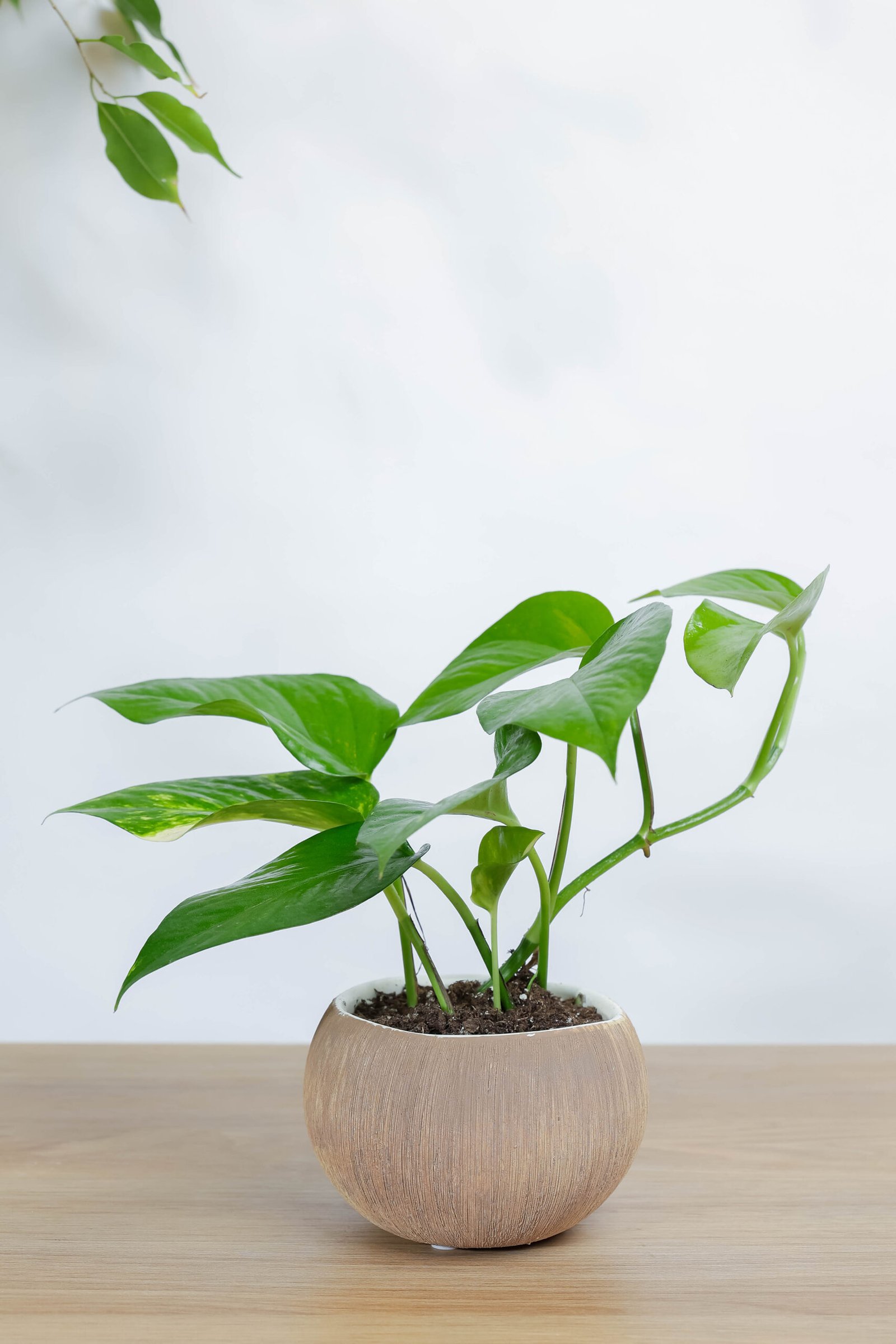 نبتة بوتس طبيعية بأوراقها المتدلّية الجذابة، مزروعة في اصيص سيراميك بوجه مميز ، لتكون هدية مثالية أو لمسة خضراء فاخرة لديكورك .