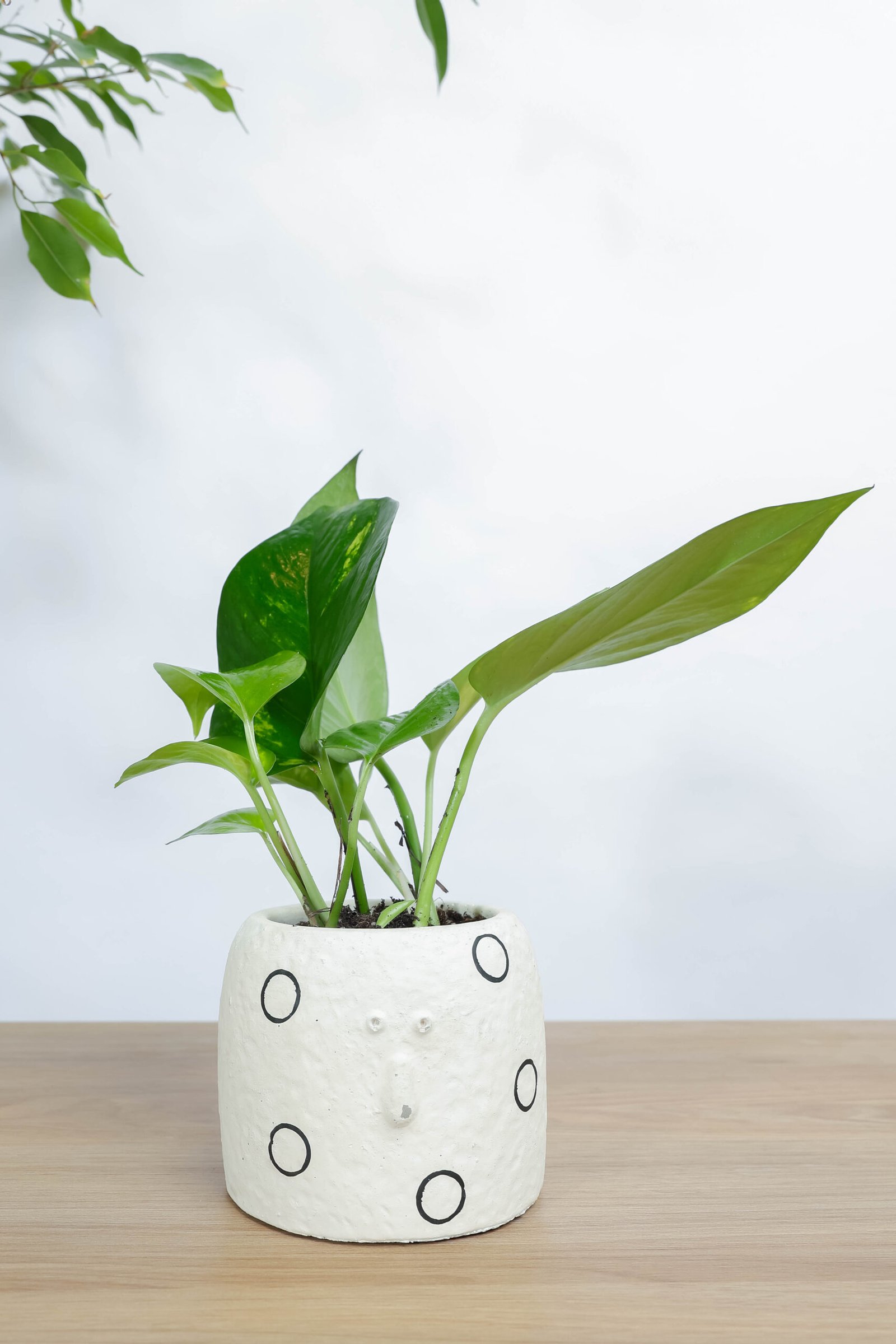 نبتة بوتس طبيعية بأوراقها المتدلّية الجذابة، مزروعة في اصيص سيراميك بوجه مميز ، لتكون هدية مثالية أو لمسة خضراء فاخرة لديكورك .